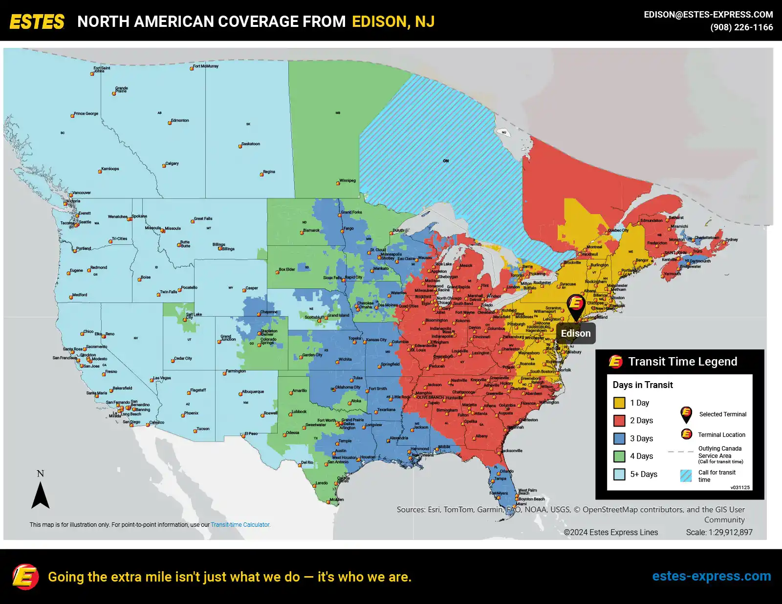 Estes offers next-day LTL freight shipping from the Edison-Plainfield-New Brunswick area to NYC, Philadelphia, Boston, Toronto, Montreal, DC, Pittsburgh, Cleveland, Raleigh, Baltimore, Buffalo, New Haven—and more.